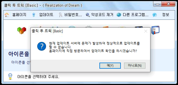 주의 2. 클릭 투 트윅 설치가 완료되면 '현재 업데이트 서버에 문제가 발생하여 정상적으로 업데이트를 할 수 없습니다. 홈페이지에 직접 방문하여서 업데이트 확인을 하시겠스니까?' 라는 창이 뜹니다.