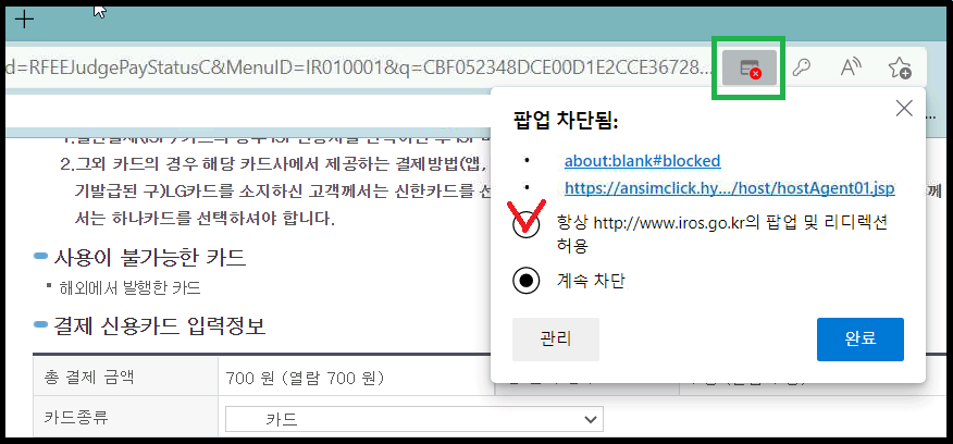 인터넷 결제 시 '팝업차단을 해제하신 후 결제를 하시기 바랍니다. 해결 방법