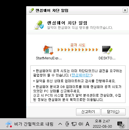 현재 2022년 8월 30일 searchapp.exe, 엑셀, explorer.exe, 윈도우 스타트 메뉴(StartMenuExperienceHost.exe)가 실행되면 알약의 랜섬웨어 차단 알림이 뜨면서 실행이 되지 않는 오류가 발생하고 있습니다.