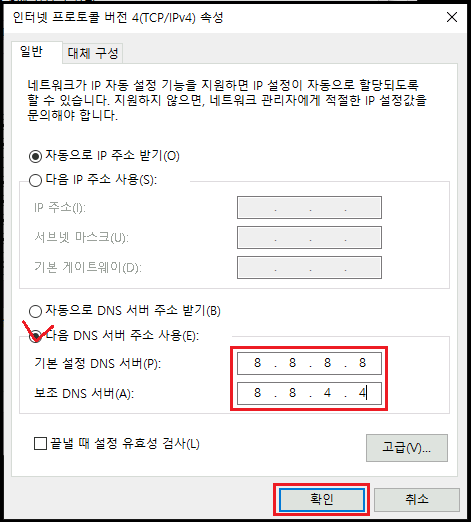 기본 설정 DNS 서버(P) : 8. 8. 8. 8