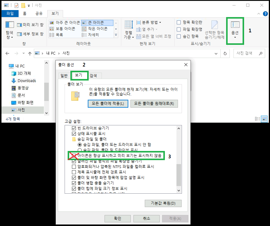 3.아이콘은 항상 표시하고 미리 보기는 표시하지 않음 - 체크 해제를 해주세요.