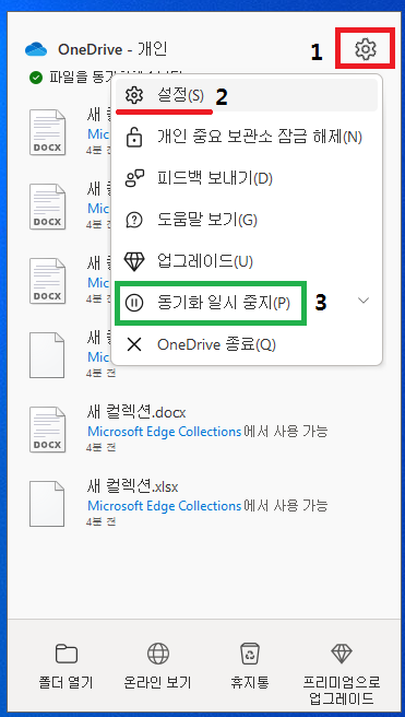 2. 설정 - 동기화 일시 중지 또는 OneDrive 종료