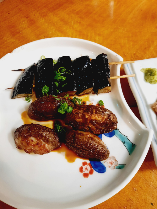 한참후에 마지막 1개의 꼬치가 더 나오네요. 가지와 버섯입니다. 괜찮은데요. 가지는 흐느적거리지 않고 버섯은 꼬돌합니다.
