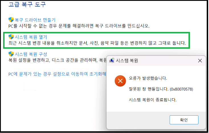 컴퓨터 마우스는 문제가 없는데 키보드 자판이 쳐지지 않는 문제가 생겼습니다. 갑자기 생긴 문제라서 컴퓨터 환경을 이전 날짜로 돌리기 위해서 시스템 복원을 해보기 위해서 제어판 - 복구 - 시스템 복원 열기를 클릭했으나 아래와 같은 오류가 발생합니다.