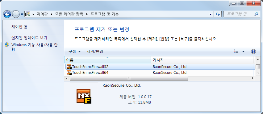 제어판 - 프로그램 및 구성 - 게시자가 RaonSecure로 되어있는 TouchEn 프로그램을 모두 삭제하면 됩니다.