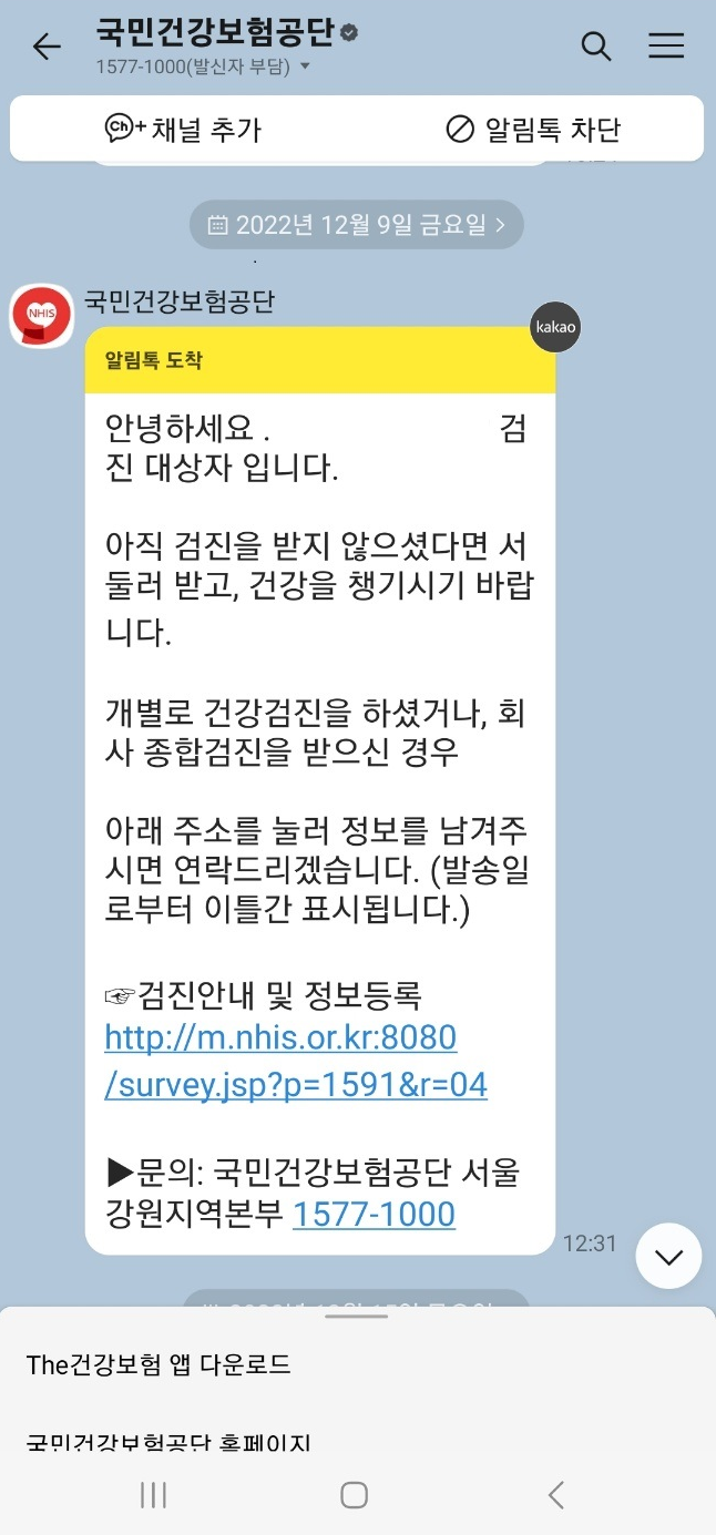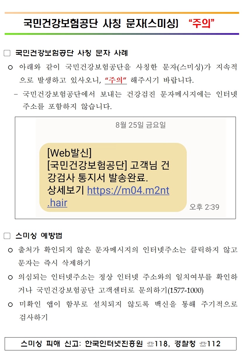 잊을만하면 받게되는 스미싱 문자가 이번에는 국민건강보험공단을 사칭하네요. 국민건강보험공단 사칭은 이번에 처음 생긴것은 아니고 매년 한번씩 배포를 하는 것 같습니다.