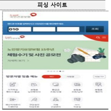 사칭 문자의 URL 주소를 클릭하면 개인정보 유출을 위한 국민건강보험공단 피싱사이트(가짜사이트)로 넘어가게 됩니다.