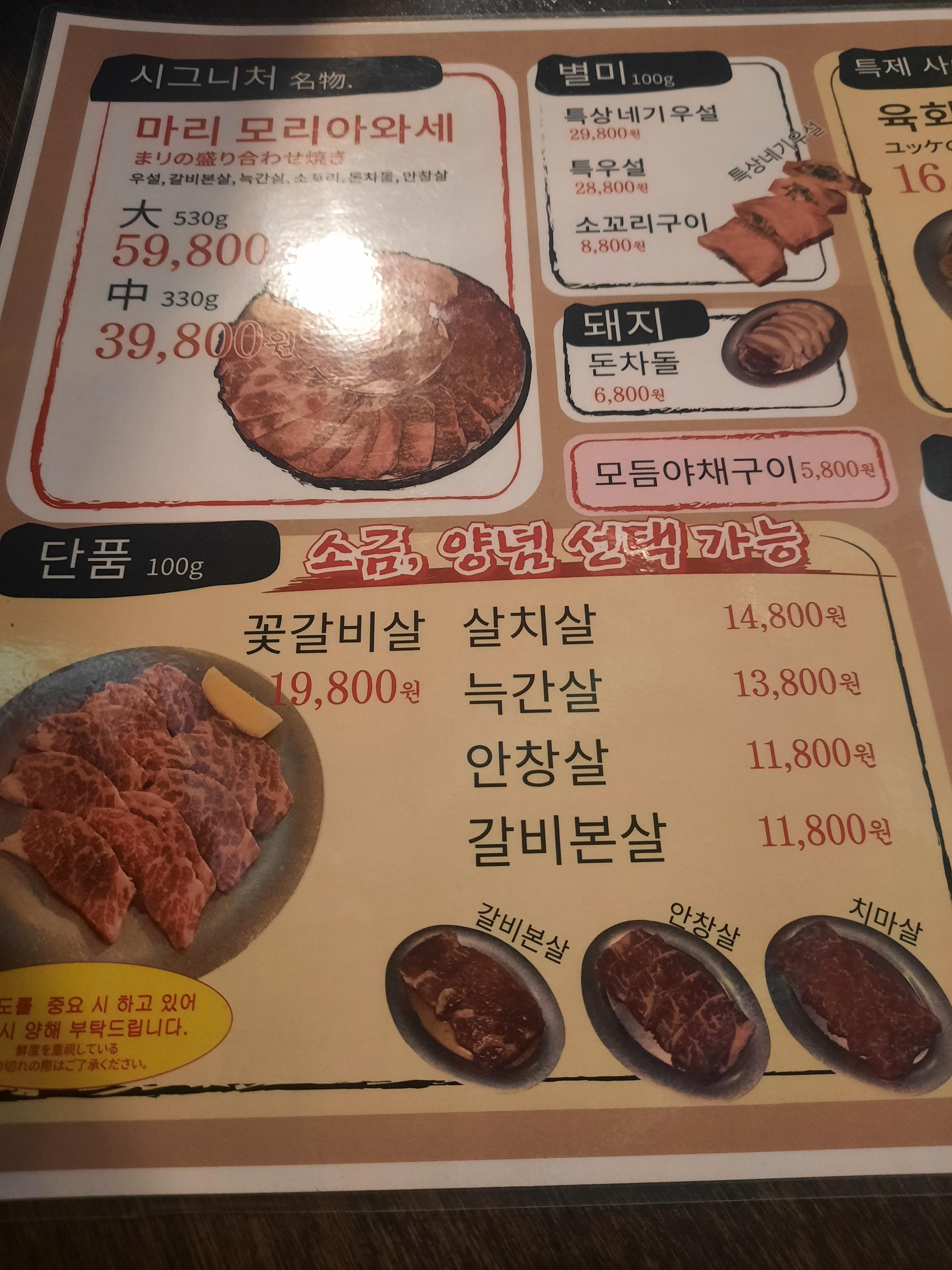 야키니쿠마리의 시그니쳐 음식 마리모리아와세가 나왔네요. 사이즈는 '대'. 2차까지 가야해서 특상 네기 우설을 못 먹은 게 너무 아쉽네요.