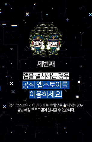 공식 앱스토어가 아닌 경로를 통해 앱을 설치하는 경우 불법 해킹 프로그램이 설치될 수 있습니다.