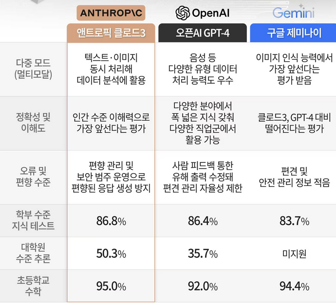 12일 로이터, CNBC, 더버지 등 외신에 따르면 앤트로픽의 클로드3는 다양한 벤치마크 시험에서 오픈AI ‘GPT-4′와 구글 ‘제미나이 울트라’를 넘어서는 성능을 보였다. 대학 학부 수준의 지식(MMLU), 대학원 수준의 추론(GPQA), 기본 수학(GSM8K) 등 모든 분야에서 클로드3가 현재까지 나온 생성형 AI 중 가장 강력한 성능을 나타낸 것이다.