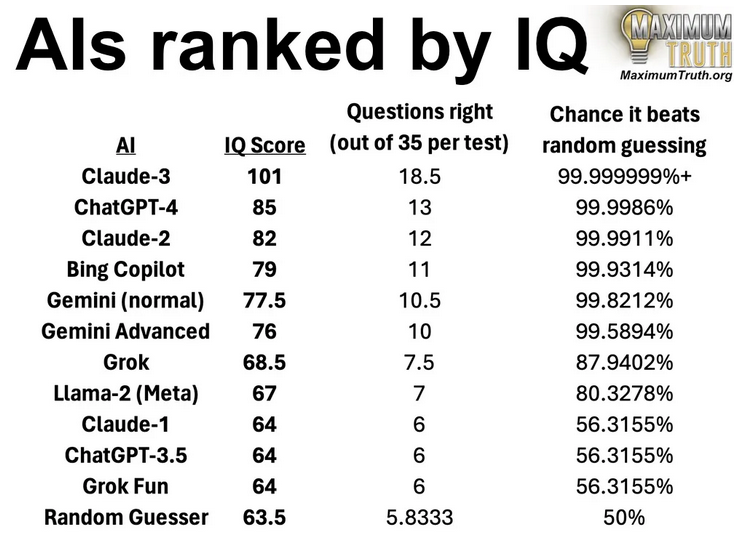 미국 경제매체 CNBC는 지난 4일 AI 스타트업 앤트로픽이 만든 거대언어모델(LLM) ‘클로드3′에 대해 “역대 가장 강력한 챗봇이 나왔다”라며 “클로드3의 지능지수(IQ)가 인간 평균치인 100을 넘어섰다는 테스트 결과가 나왔다”라고 했다.