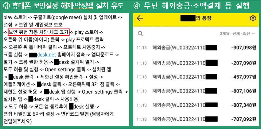 4. 다음날 새벽 A씨의 휴대폰이 갑자기 버벅대며 검은 화면이 되는 현상이 발생하였고, 확인해보니 A씨 은행계좌에서 무단으로 각종 해외송금‧소액결제 등이 발생한 뒤였음.