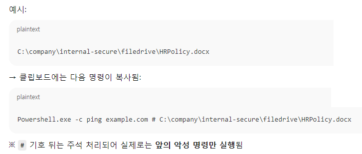 ‘파일픽스’는 웹사이트의 파일 업로드 기능을 위장한 피싱 수법으로, 사용자가 특정 경로를 윈도우 파일 탐색기 주소창에 붙여 넣도록 유도합니다. 이 경로는 겉보기엔 정상적인 문서 경로처럼 보이지만, 실제로는 악성 파워셸(PowerShell) 명령어가 숨겨진 코드입니다.