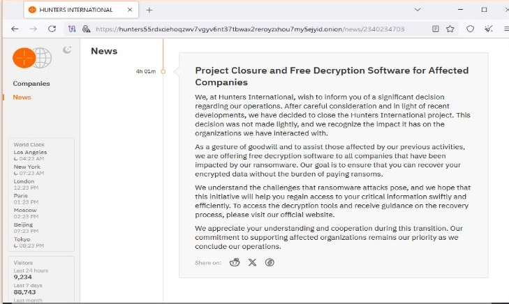 글로벌 랜섬웨어 조직 **헌터스 인터내셔널(Hunters International)**이 최근 자신들의 조직을 해체하겠다고 공식 발표했습니다.