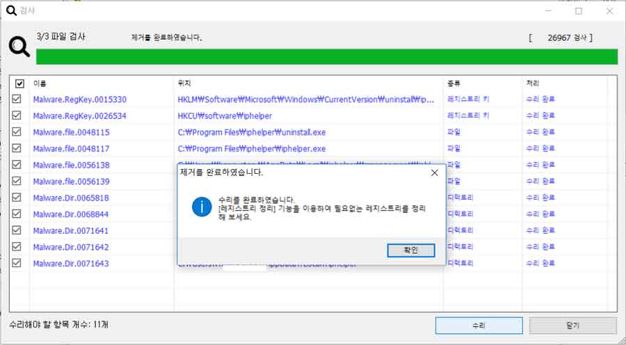 "EzClean (이지클린) - 검사"로 Windows Network IP Manager 광고프로그램이 깨끗하게 삭제가 되었다면 "EzClean (이지클린)- 레지스트리 정리"를 해주세요.