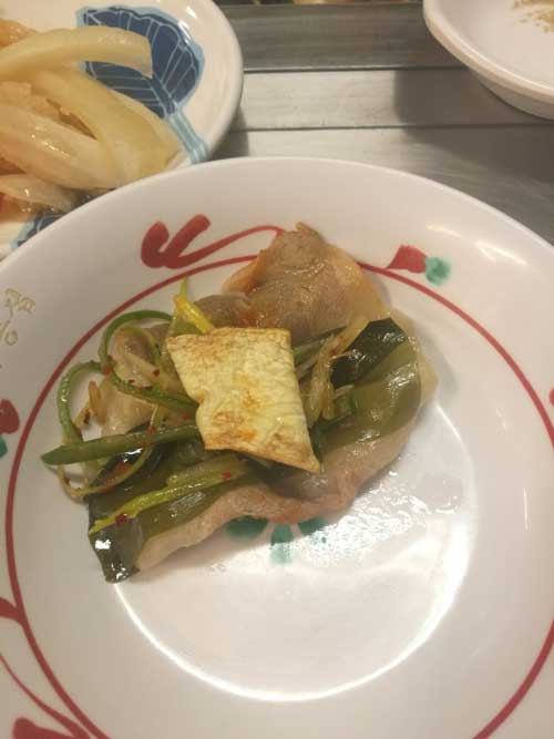 맛있게 구워진 꽃삼겹을 접시에 한 장 올리고 구워진 버섯과 파채를 올려서 먹습니다.