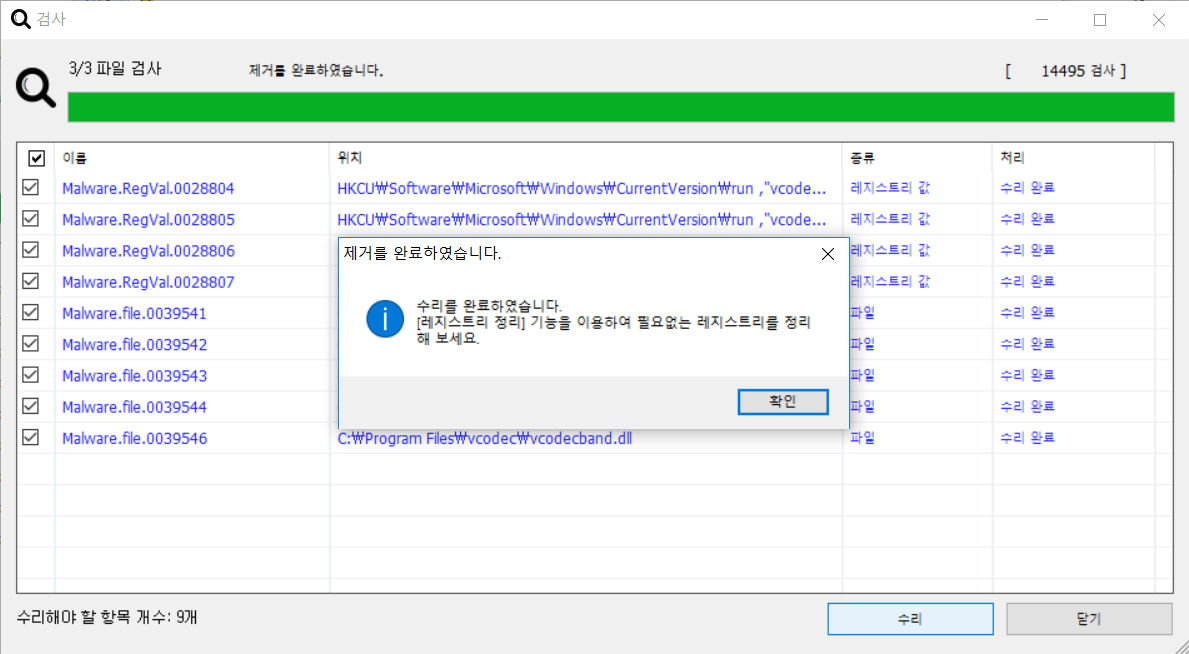 6. "검사"가 끝나면 "수리"클릭으로 해결됩니다.