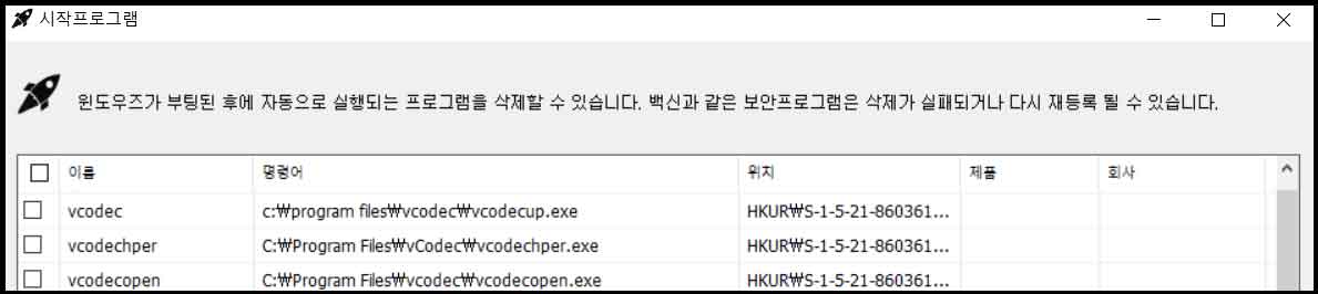 2. "이지클린 (EzClean) - 시작프로그램"을 실행하니 vcodec, vcodechper, vcodecopen 등록되어 있습니다.