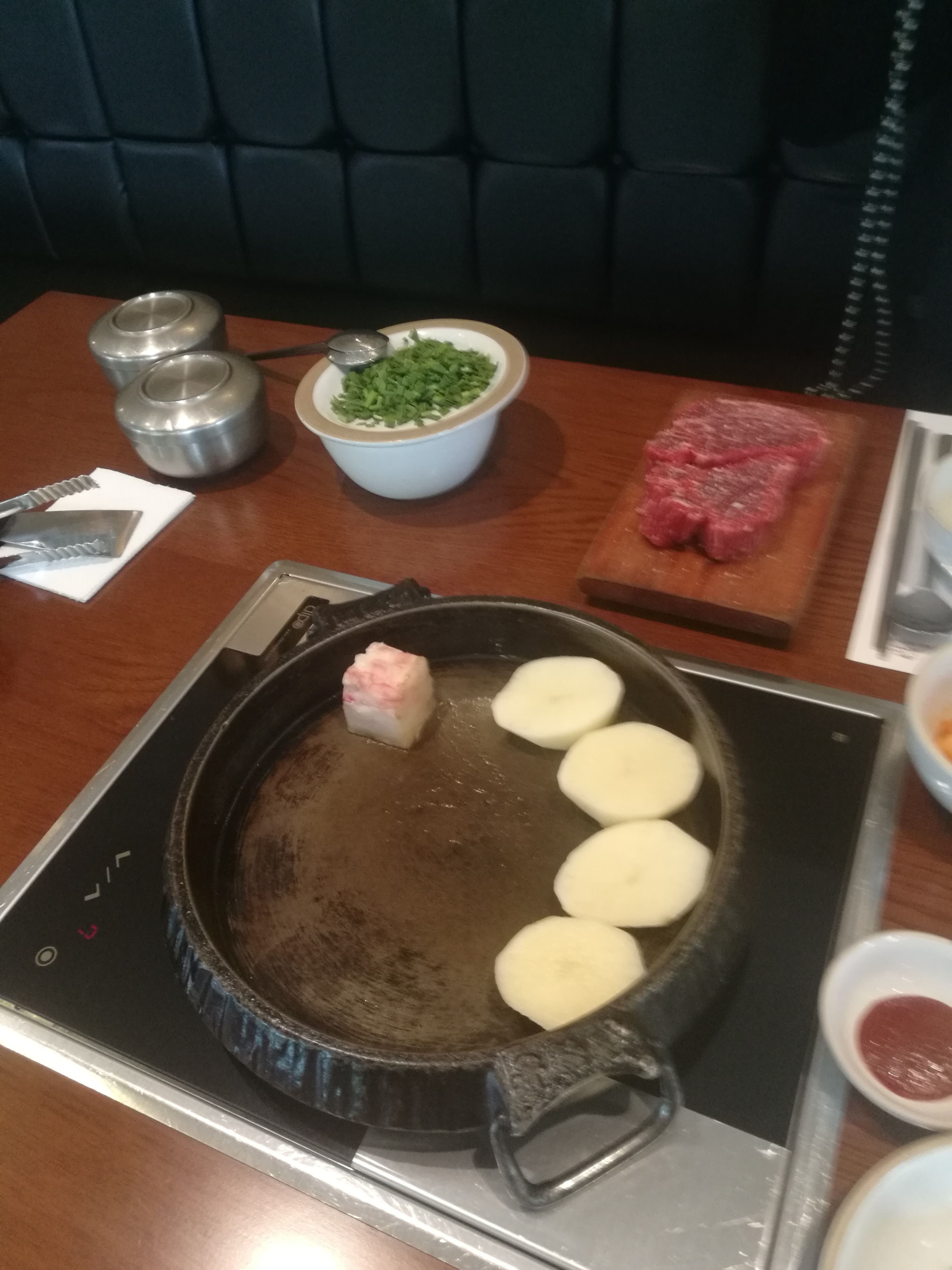 고기 특안심 2인분이 나오고 철판을 달구기 시작합니다.