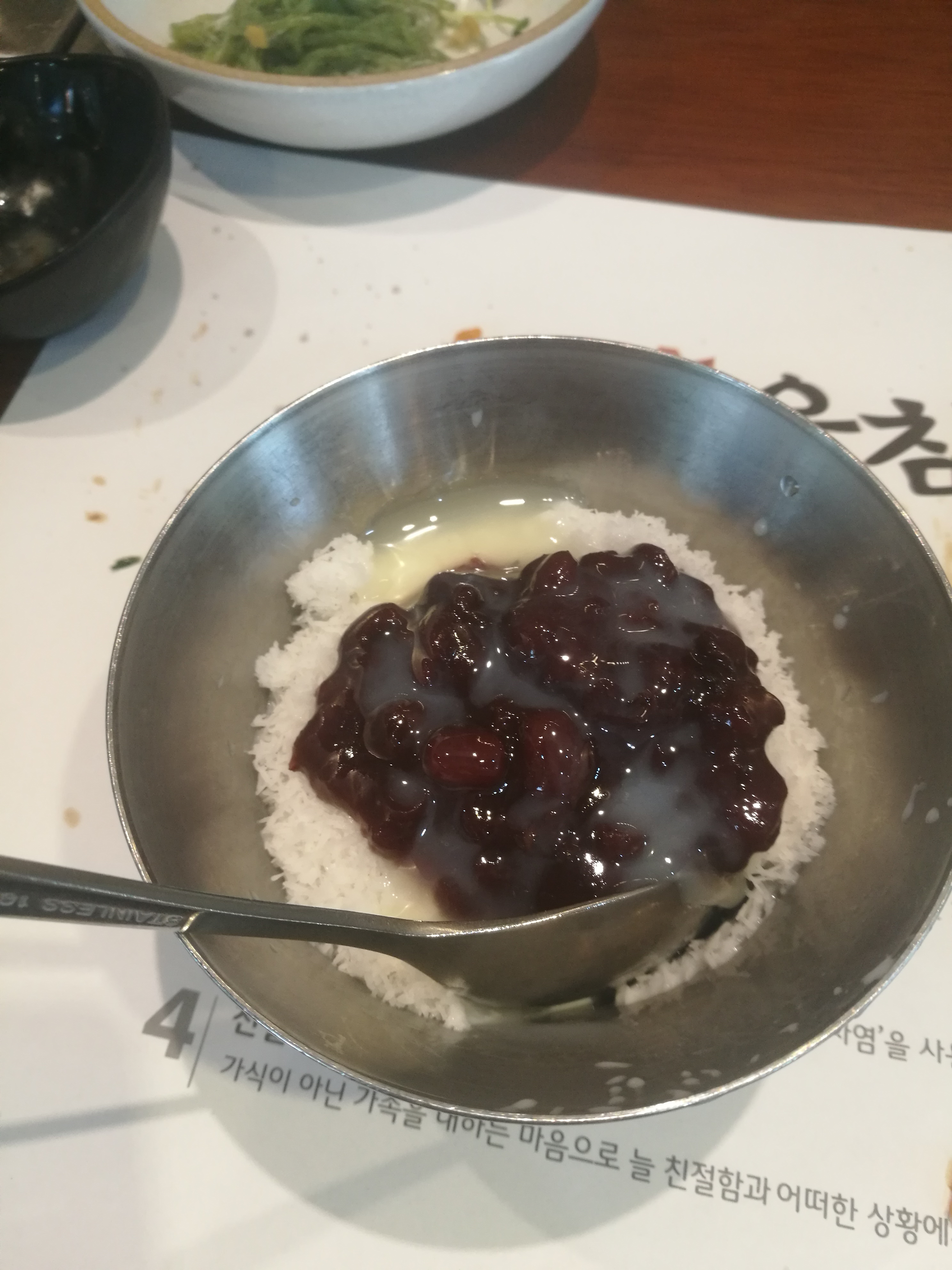 후식으로 나온 우유얼음에 팥이 얻혀진 빙수.