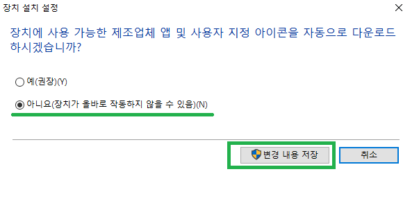 2-3. '장치 설치 설정'에서 자동으로 다운로드 하시겠습니까?