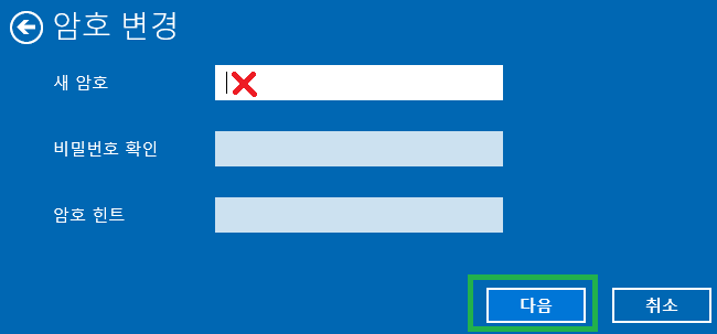 6. 암호 변경이 아닌 기존 암호를 없앨 것이기에 '새 암호'에 아무것도 입력하지말고 '다음'을 클릭해주세요.