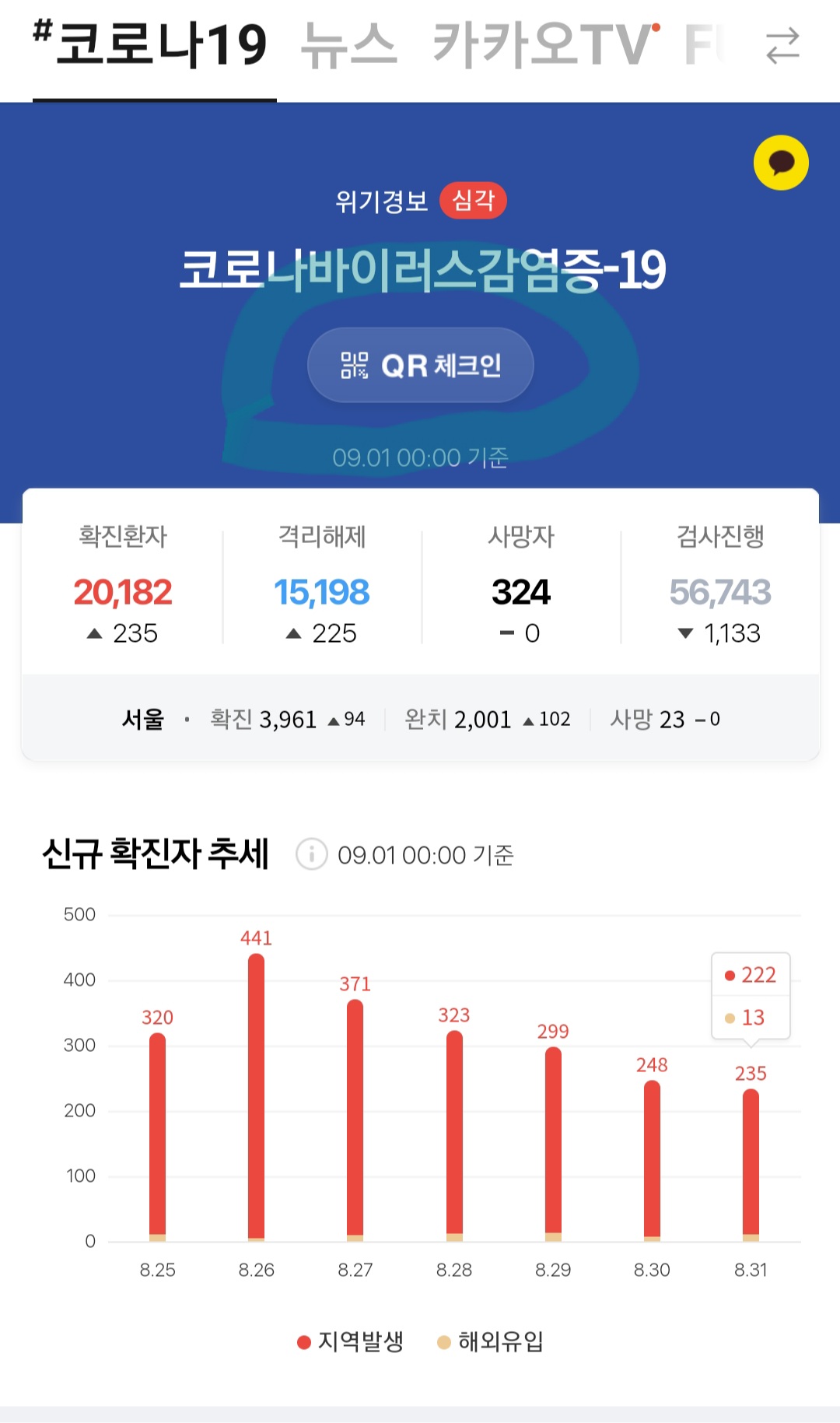 카카오톡을 열어 하단에 '#'버튼을 클릭하면 상단에 코로나19메뉴가 보입니다. 클릭하세요.