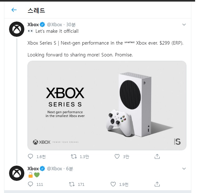 Xbox Series S 의 가격이 Xbox 트위터에 올라왔네요.