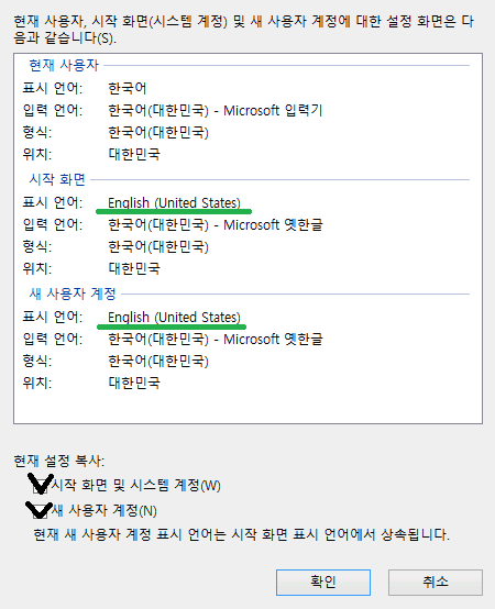 시작 화면 표시 언어 : English, 새 사용자 계정 표시 언어 : English 로 되어있네요.