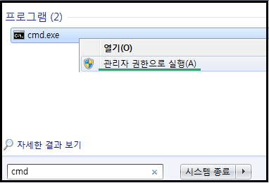 검색창에 'cmd'명령어를 치고 cmd.exe 프로그램에서 마우스 우측 클릭 '관리자 권한으로 실행'을 해줍니다.