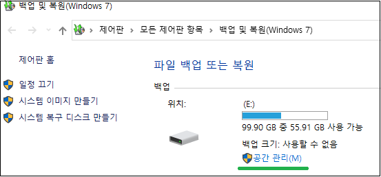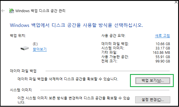 4. Windows 백업 디스크 공간 관리 - 백업 보기 클릭하세요.