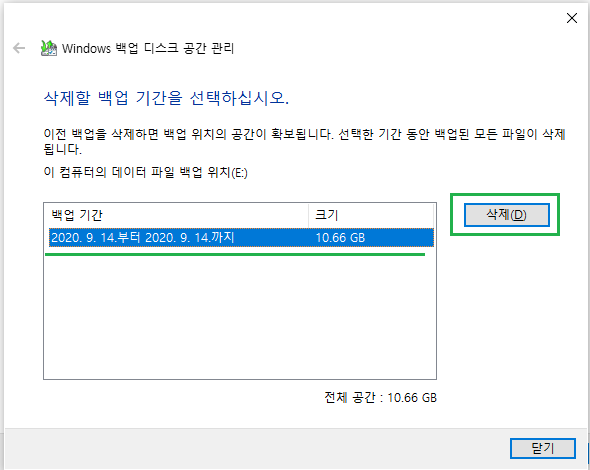 5. 백업 기간에서 삭제할 목록응 선택 후 삭제를 클릭합니다.