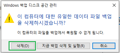 6. '이 컴퓨터에 대한 유일한 데이터 파일 백업을 삭제하시겠습니까?'