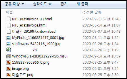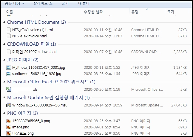 '내 컴퓨터' 또는 '다운로드' 폴더에 들어갔는데 파일들이 나눠져있네요. 이전에는 한줄로 쭉 정렬이 되었었는데 말이죠. 이것도 찾는데 살짝 시간이 걸렸네요.