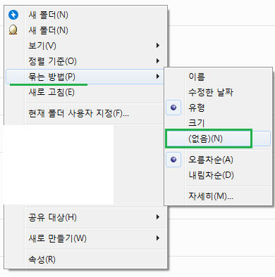 폴더를 열어서 빈 공간에 마우스 우측 클릭 - 묶는 방법 - (없음)(N)을 선택해주면 끝.