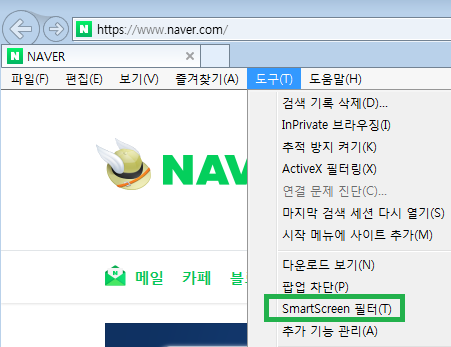 해결방법 : 인터넷 창 - 도구 - SmartScreen필터 - SmartScreen 필터 끄기를 선택해주면 됩니다.