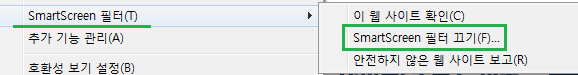 SmartScreen 필터를 꺼도 같은 팝업창이 뜨면 크롬을 사용하시면 됩니다.