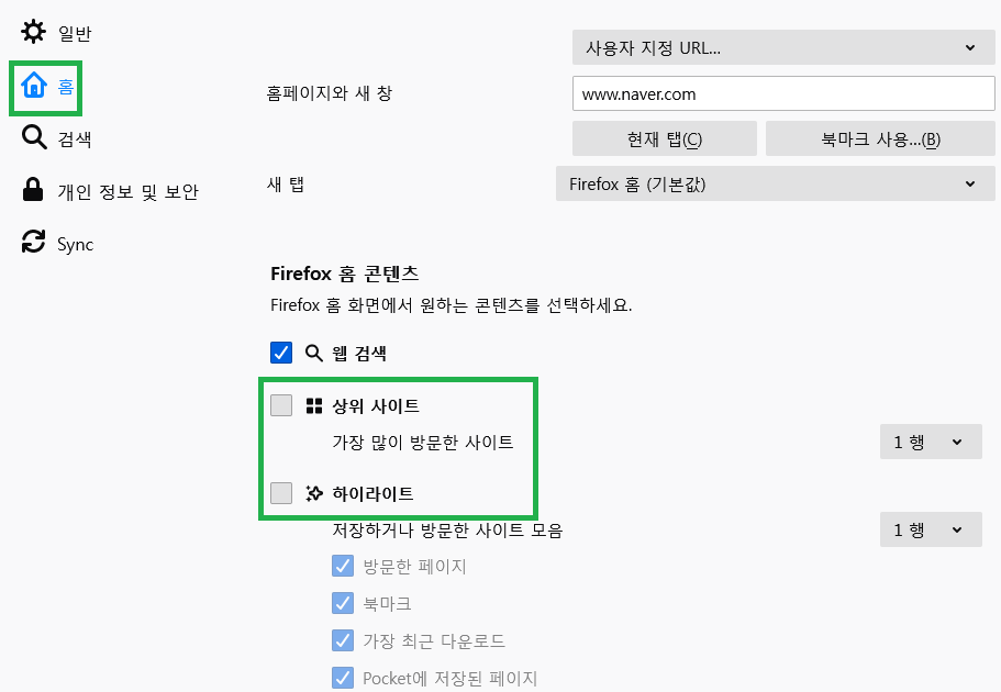 2. 홈 - 상위 사이트와 하이라이트 체크 해제