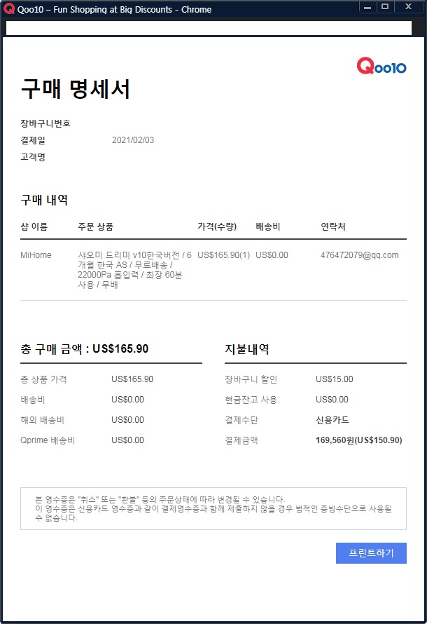 다 필요없고 샤오미는 저렴한 가격에 사서 쓰다가 버리고 새로 사면되지 하는 생각에 사는거니깐. 드리미 V10 + 스탠딩 거치대까지 169,560원이면 네이버나 다나와에서 검색해서 나오는 가격보다 저렴하게 산 것 같다. 그리고 Qoo10 배송도 그렇게 느리지 않다.