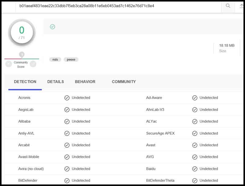 바이러스 토탈에서 이지클린 설치파일을 분석한 값입니다.