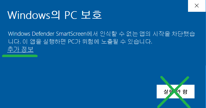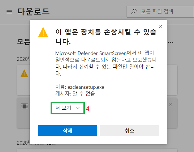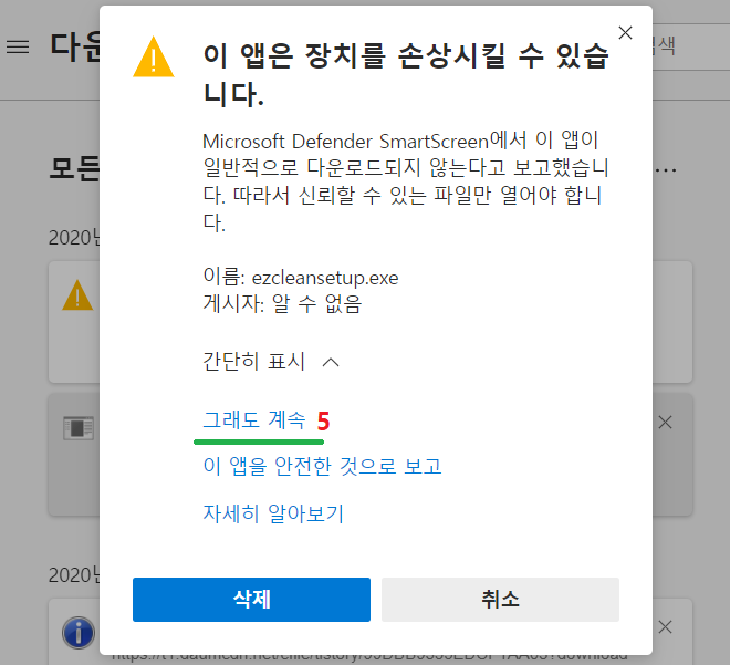 * 처음 이지클린 설치시 윈도우 10에서 smartscreen 경고창이 뜰 수 있습니다.