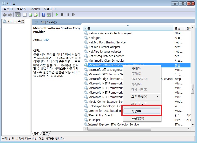 2. 서비스 목록이 나오면 "Microsoft Software Shadow Copy Provider"를 찾는다. 마우스 우클릭 한 다음 "속성"을 선택한다.