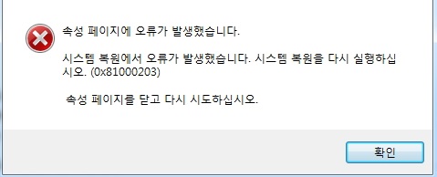 윈도우즈 시스템 복원을 시도할 때 "속성 페이지에 오류가 발생했습니다. 시스템 복원에서 오류가 발생했습니다. 시스템 복원을 가시 실행하십시오.(0x81000203)"와 같은 오류가 발행할 수 있다.