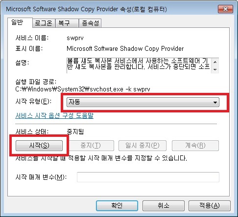3. "일반"탭에서 시작 유형을 "자동"으로 바꾸고, 서비스 상태가 "중지됨"으로 되어 있으면 "시작"버튼을 누른다.