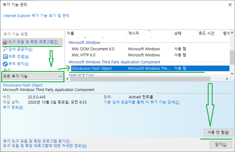 인터넷 익스플로러 - 도구 - 추가 기능 관리