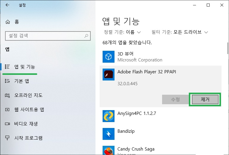 앱 및 기능 - Adobe Flash Player 32 PPAPI - 제거