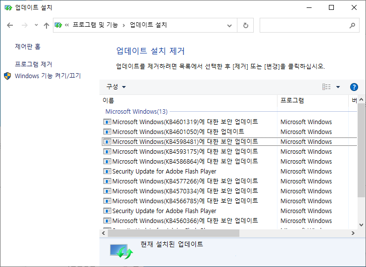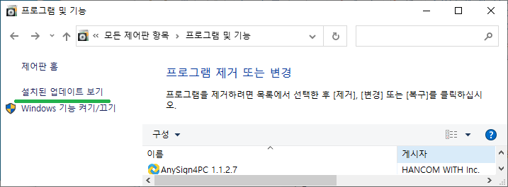 제어판 - 프로그램 및 기능 - 설치된 업데이트 보기