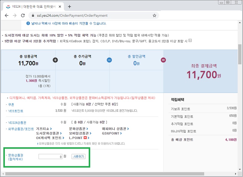 구매할 책을 선택 후 결제란에서 문화상품권(컬쳐랜드) 사용하기 선택