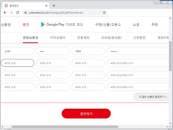 문화상품권 핀번호를 입력하고 충전하기 클릭