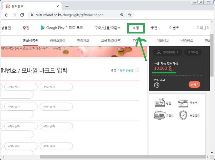 컬쳐캐쉬를 이용 시에 꼭 컬쳐랜드 홈페이지의 쇼핑을 선택하라고 되어 명시가 되어 있습니다.